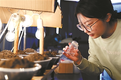 在草地改良試驗(yàn)平臺(tái),博士生格格在取土樣。團(tuán)隊(duì)在這個(gè)小區(qū)內(nèi)鋪設(shè)了水管,想看看如果保證有足夠多的水和肥,草能長(zhǎng)多高,草地的生產(chǎn)潛力有多大。