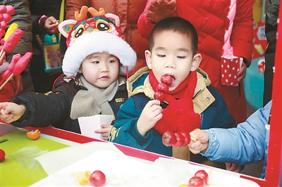 近日,中國兒童中心實(shí)驗(yàn)幼兒園舉辦了第四屆“冬之語”活動,老師們把廟會“搬進(jìn)”了幼兒園。教學(xué)樓大廳、藝術(shù)宮一層走廊里,熙熙攘攘,熱鬧非凡;美食一條街上,糖葫蘆、棉花糖、爆米花飄出陣陣香氣;孩子們創(chuàng)作的年畫充滿童趣;愛心義賣場人頭攢動……在真實(shí)體驗(yàn)中,孩子們感受年俗、共享年趣。圖為孩子們品嘗手工制作的糖葫蘆。楊麗莎 攝
