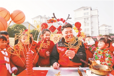 1月12日,在江蘇省如皋市城南街道新華社區(qū)新華幼兒園內(nèi),小朋友們在觀賞糖畫制作。當日,江蘇省如皋市城南街道新時代文明實踐所、新華社區(qū)婦聯(lián)聯(lián)合新華幼兒園舉辦“傳統(tǒng)游園會 歡樂迎新春”活動,小朋友觀賞糖畫制作,學習做年糕,體驗剪窗花,體驗傳統(tǒng)民俗,喜迎新春佳節(jié)。徐慧 攝