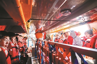 逃生技能學(xué)習(xí)是另一節(jié)充滿體驗(yàn)感的課程,師生們穿上救生衣、帶著防寒服,在海風(fēng)凜冽的甲板上集合,有序進(jìn)入逃生艇?!皷|3”船的大副一邊維持秩序,一邊為大家介紹逃生艇內(nèi)的設(shè)施和應(yīng)急物品。狹小逼仄的艇內(nèi)空間,給逃生演習(xí)增添了一分緊張感,也讓師生們對(duì)海洋科考工作的風(fēng)險(xiǎn)有了真切的體驗(yàn)。