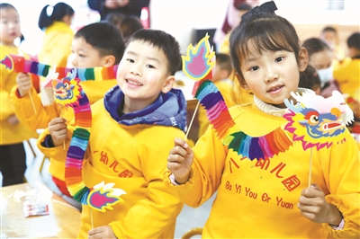 日前,江蘇省連云港市連云區(qū)墟溝街道南山社區(qū)與轄區(qū)八一幼兒園聯(lián)合開展“巧手做舞龍 傳承龍文化”主題活動(dòng)。孩子們在志愿者引導(dǎo)下,用靈巧的小手,對材料進(jìn)行拼接、粘貼,制作出一條條漂亮的拉花舞龍。圖為孩子們在展示自己的作品。通訊員 朱華南 攝