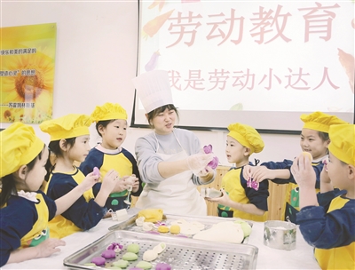 日前,一場熱鬧的“我是勞動小達人”活動在山東省青島市市北區(qū)樺川路幼兒園舉行。該園依托“十四五”規(guī)劃課題,通過一日生活中的勞動教育,培養(yǎng)幼兒獨立自主能力,讓幼兒學會自己穿衣、整理物品、擦桌子、照顧動植物等,爭做勞動小達人。圖為大班幼兒在教師指導下學做面食。本報記者 孫軍 攝