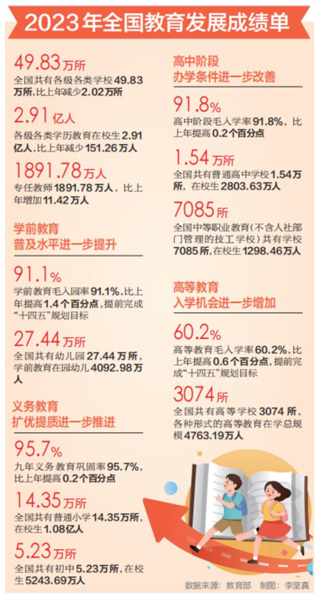 2023年,九年義務(wù)教育鞏固率95.7%,比上年提高0.2個(gè)百分點(diǎn);高中階段毛入學(xué)率91.8%,比上年提高0.2個(gè)百分點(diǎn);特殊教育學(xué)校數(shù)量比上年增長(zhǎng)1.34%;學(xué)前教育毛入園率和高等教育毛入學(xué)率均提前完成“十四五”規(guī)劃目標(biāo),分別達(dá)到91.1%和60.2%。