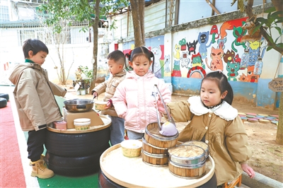 廈門市第六幼兒園比鄰廈門大學(xué)、南普陀寺,周邊還有網(wǎng)紅景點“頂澳仔貓街”和“沙坡尾”。該園孩子們模擬社區(qū)市場,舞龍、投壺、制作小燈籠、搓湯圓。圖為孩子們在幼兒園的“貓街”玩“賣小吃”游戲。本報記者 熊杰 攝