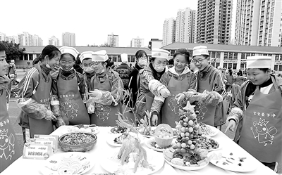 近日,重慶市永川區(qū)興龍湖小學(xué)的學(xué)生們欣賞自己烹飪的美食。該校舉行第二屆勞動技能大賽,六年級學(xué)生在教師和家長的配合下,準(zhǔn)備食材、烹飪炒制、調(diào)味裝盤……現(xiàn)場菜香四溢,一派忙碌景象。陳仕川 攝