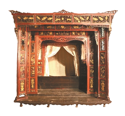 現(xiàn)收藏于中南民族大學(xué)民族學(xué)博物館的土家族三滴水床,為清代原件,黃楊木制,屬大型雕花家具。床寬、高各2.68米,進(jìn)深2.51米,內(nèi)鋪長2.1米,寬1.4米。整張床全部采用傳統(tǒng)的榫卯結(jié)構(gòu)制作而成,工序繁多,工藝復(fù)雜,刻花板檐額三層,呈喇叭狀由內(nèi)向外擴(kuò)展,上雕蝙蝠、花瓶、服飾、房屋、金瓜及各種花草等,雕花圖案大多有“取諧音喻吉祥”之意。蓮花寓意著蓮生貴子;金瓜寓意著瓜瓞綿綿;蝙蝠寓意著福壽如意;花瓶中插著蓮花與三根戟,寓意“平平安安、連升三級”。浮雕、鏤雕相映成趣,堪稱土家族雕刻藝術(shù)精品。