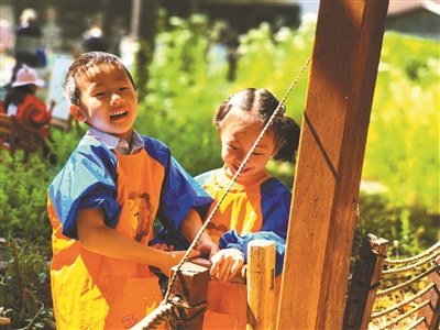 “幼兒園就是孩子的家,在這里他們能做主,里里外外的空間都能走進(jìn)去、玩起來?!备眻@長杜丹說,理想中的幼兒園就像家一樣,教師和孩子一起過日子,孩子有安全感和歸屬感,游戲時更自主、專注、投入。