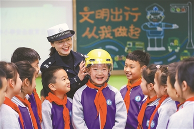 3月25日是全國(guó)中小學(xué)生安全教育日,山東省青島市公安局交通警察支隊(duì)李滄大隊(duì)民警當(dāng)天走進(jìn)青島汾陽(yáng)路小學(xué),講解交通安全知識(shí),引導(dǎo)學(xué)生文明出行。圖為民警給學(xué)生講解如何正確佩戴頭盔。張鷹 攝