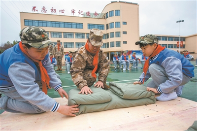 3月28日,安徽省蕪湖市繁昌區(qū)繁陽(yáng)鎮(zhèn)實(shí)驗(yàn)小學(xué)組織少先隊(duì)員走進(jìn)該區(qū)人武部,開(kāi)展“國(guó)防教育”主題活動(dòng)。少先隊(duì)員們走進(jìn)軍營(yíng),通過(guò)實(shí)踐等多種形式,普及國(guó)防知識(shí),激發(fā)少先隊(duì)員愛(ài)軍、擁軍之情。圖為該校少先隊(duì)員在軍訓(xùn)教官的指導(dǎo)下體驗(yàn)疊軍被。 肖本祥 攝