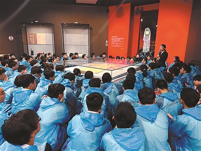 在跟隨學(xué)生觀展的1個多小時里,記者注意到,展館里隨處可見擺放整齊的小板凳,以供教師結(jié)合展品隨時開展思政教學(xué)——