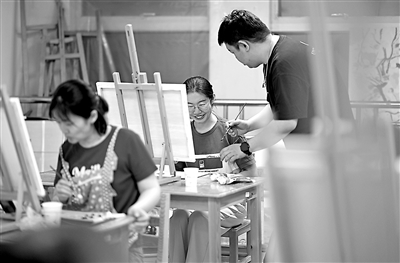 4月26日,在天津青年宮,青年夜校教師指導(dǎo)學(xué)員學(xué)習(xí)油畫。2023年底,由天津團(tuán)市委主辦的“天津市青年夜?!逼放苹顒诱絾?,免費(fèi)或低價為年輕人提供豐富多彩的特色課程。熱門課程往往一上線就被搶光,供不應(yīng)求。