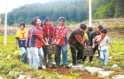 近日,貴州省黔西市文峰街道黎明小學(xué)學(xué)生在水西街道石園社區(qū)的土豆基地搬運(yùn)土豆。該校組織教師,把學(xué)生帶進(jìn)土豆基地,挖土豆、撿土豆、搬運(yùn)土豆等,培養(yǎng)他們珍惜勞動(dòng)果實(shí)的美德,讓學(xué)生親身感受勞動(dòng)的辛勞和收獲果實(shí)的愉悅。周訓(xùn)超 攝