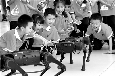 近日,在重慶市北碚區(qū)朝陽小學(xué),孩子們在觀看機器狗表演。當(dāng)天,該校第33屆科技節(jié)開幕,孩子們在現(xiàn)場觀摩體驗自動旋轉(zhuǎn)門、自動洗衣機、電子狗等科技項目?;顒蝇F(xiàn)場,通過科普講解、互動體驗等方式,他們零距離感受科技的魅力,激發(fā)了崇尚科學(xué)、探索未知的興趣。秦廷富 攝