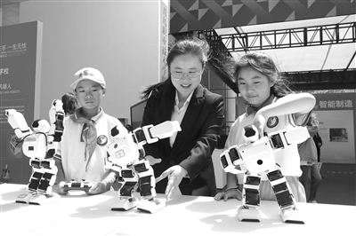 5月14日,2024年職業(yè)教育活動周山東啟動儀式在青島舉行。同時,面向青少年開放信息技術(shù)、智能制造、先進設(shè)備、AI賦能等4個主題的職業(yè)教育展示體驗項目,旨在增強中小學生對職業(yè)教育的理解與認知。圖為青島工貿(mào)職業(yè)學校教師在引導小學生體驗機器人編程項目。