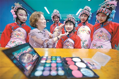 近日,山西省聞喜縣禮元中心校裴柏小學(xué)戲曲社團(tuán)老師給學(xué)生化妝。近年來(lái),聞喜縣通過(guò)開(kāi)展“戲曲進(jìn)校園”活動(dòng),傳播戲曲藝術(shù),讓學(xué)生在學(xué)習(xí)戲曲表演的同時(shí)感受傳統(tǒng)文化的魅力,豐富課余文化生活。
