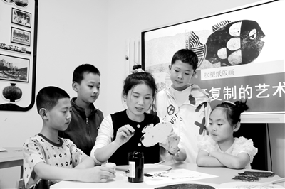 5月26日,20余名小學(xué)生在志愿者帶領(lǐng)下走進甘肅省平?jīng)鍪徐o寧縣博物館,參加主題為“復(fù)制古老文明 保護文化遺產(chǎn)”的吹塑紙版畫制作活動。圖為志愿者帶領(lǐng)學(xué)生制作版畫。