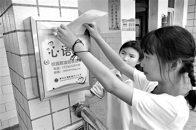 6月12日,湖北省十堰市鄖陽(yáng)區(qū)柳陂鎮(zhèn)中心小學(xué)雙胞胎留守兒童周芷莀和周苡莀把“心事”寫(xiě)成書(shū)信投進(jìn)“心語(yǔ)箱”。針對(duì)目前留守兒童多、溝通難的實(shí)際,鄖陽(yáng)區(qū)為238所學(xué)校設(shè)置“心語(yǔ)箱”700多個(gè),鼓勵(lì)孩子們把平時(shí)不敢說(shuō)、無(wú)處說(shuō)的話“悄悄”寫(xiě)出來(lái),通過(guò)“心語(yǔ)箱”告訴學(xué)校,從而幫助學(xué)生解開(kāi)“心里的疙瘩”,快樂(lè)地成長(zhǎng)。
