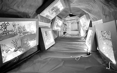 活動過程:教師和幼兒對合肥本土的歷史和文化進行了討論,投票選出了合肥景點、合肥人物、合肥美食三方面幼兒感興趣的內容,并將其作為“光影合肥”中的三條通道,創(chuàng)設了逍遙津、李鴻章故居、合肥科技館等場景。幼兒手持手電筒,依次有序地爬行穿越“時光隧道”,利用鏡面、鐳射紙反射出來的光,照亮隧道內有關合肥景點、人物、美食的圖片,在探索的過程中了解本土文化。