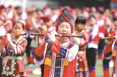 7月4日,貴州省銅仁市玉屏侗族自治縣印山民族小學(xué)學(xué)生在大課間吹奏簫笛。當(dāng)?shù)貙⒑嵉汛底?、竹竿舞等特色?xiàng)目融入大課間活動(dòng),讓學(xué)生們學(xué)習(xí)和傳承民族文化,營(yíng)造積極、健康、向上的校園文化氛圍。胡攀學(xué) 攝