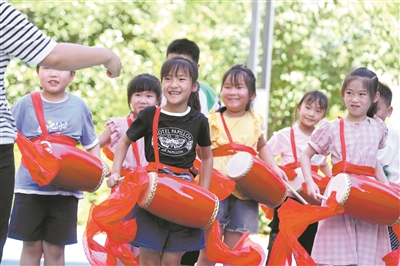 近日,在浙江省德清縣阜溪街道板橋社區(qū)工會驛站,參加暑期愛心托班的孩子們在學習打腰鼓。為緩解暑期外地職工子女看護難題,阜溪街道總工會將文化禮堂等文化功能室打造成愛心托管課堂,并組織志愿者開展形式多樣的活動,讓孩子們樂享暑期生活。 謝尚國 攝
