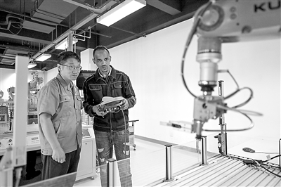 涂則鋼(右)在天津職業(yè)技術(shù)師范大學(xué)教師鐘平的指導(dǎo)下測(cè)試工業(yè)機(jī)器人編程系統(tǒng)(7月19日攝)。新華社記者 孫凡越 攝