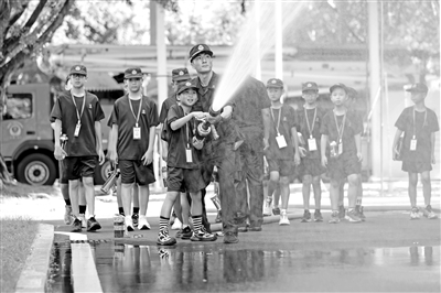 7月29日,在福建省廈門市海滄區(qū)消防救援大隊(duì),小學(xué)生在消防員的指導(dǎo)下體驗(yàn)手持水槍“滅火”。新華社發(fā)