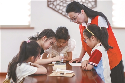 8月3日,在江蘇省興化市圖書(shū)館“活字印刷”體驗(yàn)館,學(xué)生在黨員志愿者的指導(dǎo)下體驗(yàn)活字印刷。當(dāng)日,興化市圖書(shū)館開(kāi)展“書(shū)香潤(rùn)童年 攜手印美好”活字印刷體驗(yàn)活動(dòng),讓學(xué)生領(lǐng)略活字印刷的獨(dú)特魅力,感受中國(guó)漢字之美。 周社根 攝
