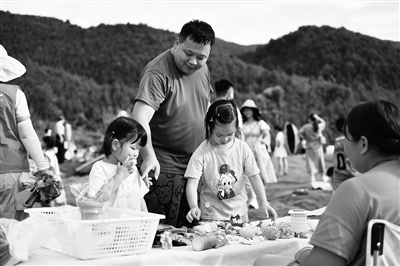 8月25日,家長帶著小朋友觀看大元社孩子們制作的手工藝品。在湖南省永州市寧遠(yuǎn)縣,一場鄉(xiāng)村青少年藝術(shù)節(jié)在九嶷山腳下的大元社舉行。寧遠(yuǎn)縣水市鎮(zhèn)游魚井村和朵山村的30多個(gè)孩子,與瑤族老人們一起唱瑤歌,身著自己設(shè)計(jì)、制作的服裝表演戲劇。2016年,畢業(yè)于美術(shù)院校的周燕在丈夫劉休的家鄉(xiāng)——水市鎮(zhèn)大元自然村成立大元社藝術(shù)文化交流中心,希望通過藝術(shù)的方式陪伴村里的留守兒童成長,彌補(bǔ)農(nóng)村藝術(shù)教育短板。除了平日里的藝術(shù)課程,每年寒暑假,多個(gè)高校的志愿者會(huì)來到大元社,為孩子們提供舞蹈、聲樂、文學(xué)創(chuàng)作等方面的課程。