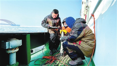 ①哈爾濱工程大學(xué)水聲通信與定位技術(shù)創(chuàng)新團(tuán)隊(duì)在冰上做實(shí)驗(yàn)。