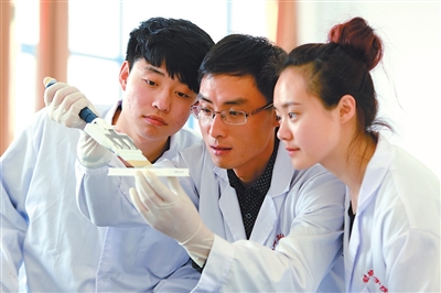 ④黑龍江農(nóng)業(yè)經(jīng)濟(jì)職業(yè)學(xué)院教師指導(dǎo)學(xué)生進(jìn)行藥品研制。