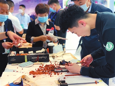 ⑤黑龍江林業(yè)職業(yè)技術(shù)學(xué)院學(xué)生在全國職教博覽會(huì)上制作紅木筷子。 黑龍江省教育廳供圖