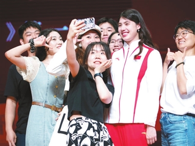 9月19日,張雨霏(右二)在活動(dòng)現(xiàn)場(chǎng)與學(xué)生自拍合影。當(dāng)日,新學(xué)期北京大學(xué)“冠軍講堂”暨《體育文化與創(chuàng)新精神》公選課開(kāi)課,世界冠軍、巴黎奧運(yùn)會(huì)獎(jiǎng)牌獲得者張雨霏、曹緣、李雯雯和鄒敬園走上講臺(tái),與北大學(xué)子互動(dòng)交流。 新華社記者 雒圓 攝