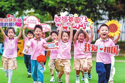 9月26日,在江蘇省興化市四牌樓幼兒園,小朋友們手持祝福標語奔跑。國慶節(jié)臨近,多地幼兒園、小學舉辦形式多樣的國慶主題趣味活動,歡樂迎國慶。