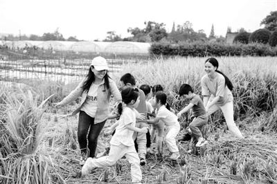教師和幼兒在田野中做游戲。譚穩(wěn) 攝