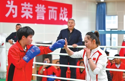 10月4日,烏魯木齊市體育運動學校邀請巴黎奧運會拳擊女子54公斤級冠軍常園(右)和學生互動。新華社記者 胡虎虎 攝