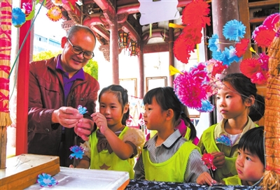 10月4日,在浙江省金華府城隍廟,小朋友觀賞手工藝人制作紙花。時寬兵 攝(新華社發(fā))