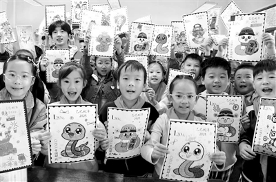10月8日,在江蘇省鎮(zhèn)江市南徐小學,江蘇科技大學志愿者和小學生一起展示設計繪制的蛇年生肖郵票。當日,志愿者來到南徐小學,指導學生設計、繪制蛇年生肖郵票,迎接“世界郵政日”的到來。石玉成 攝