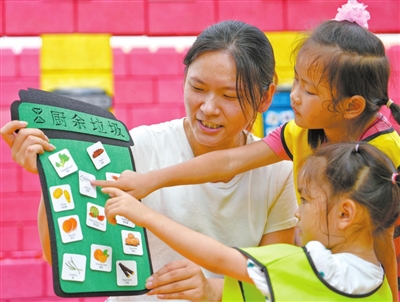 日前,江蘇省海安市墩頭鎮(zhèn)仇湖幼兒園開(kāi)展“垃圾分類(lèi) 你我‘童’行”主題教育活動(dòng),通過(guò)現(xiàn)場(chǎng)講解、互動(dòng)游戲、模擬投放等環(huán)節(jié),向孩子們普及垃圾分類(lèi)知識(shí),引導(dǎo)他們從小養(yǎng)成垃圾分類(lèi)的好習(xí)慣。圖為教師利用垃圾分類(lèi)卡片教孩子們正確分類(lèi)垃圾。 通訊員 周強(qiáng) 攝