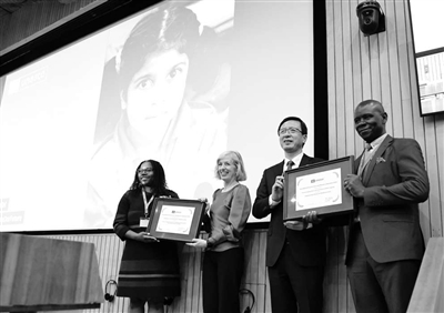 10月16日,在位于法國(guó)巴黎的聯(lián)合國(guó)教科文組織總部,烏干達(dá)機(jī)構(gòu)“促進(jìn)非洲學(xué)校平等網(wǎng)絡(luò)”的負(fù)責(zé)人(右一)和贊比亞機(jī)構(gòu)“促進(jìn)女性教育行動(dòng)”的代表(左一)出席頒獎(jiǎng)儀式。