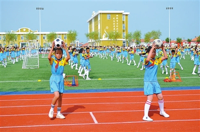 黑龍江省齊齊哈爾市泰來縣大興鎮(zhèn)中心學校的學生們在做大課間足球操,身后的樓外墻體上醒目地寫著“按教育方針辦學,走內(nèi)涵發(fā)展道路”。該校的樓內(nèi)樓外、主要會議室中都有與教育方針相關的學校文化標識。 資料圖片