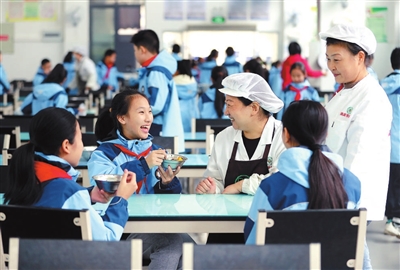 10月21日,在湖北省荊門市掇刀區(qū)名泉小學(xué)食堂,“家長主廚”在征求學(xué)生們對(duì)校園餐的意見。該校聘請(qǐng)15名家長為校園“家長主廚”,參與和監(jiān)督學(xué)校食品及原材料定價(jià)、采購等相關(guān)環(huán)節(jié),保障校園餐的安全與營養(yǎng)。 趙平 攝