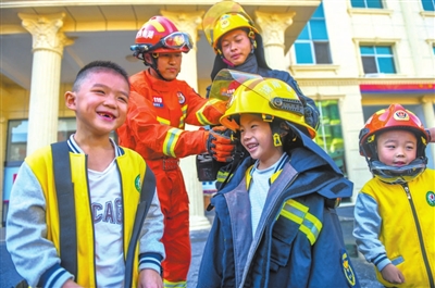 近日,在湖南省永州市道縣道州路消防救援站,小朋友在消防員的幫助下體驗(yàn)穿消防服。道州路消防救援站舉行“消防站開(kāi)放日”活動(dòng),邀請(qǐng)幼兒園師生走進(jìn)消防營(yíng)區(qū),幫助幼兒從小樹立消防安全意識(shí)。蔣克青 葉興華 攝
