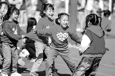 10月29日,在青島市李滄區(qū)虎山路小學,學生在課間進行“老鷹捉小雞”游戲。今年以來,李滄區(qū)在全區(qū)小學實行課間10分鐘延長至15分鐘。各學校根據(jù)實際情況開展豐富的課間活動,促進學生健康成長。 張鷹 攝