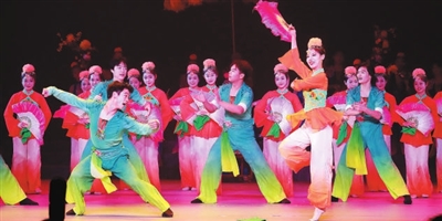 ?“我和我的祖國(guó)”安徽藝術(shù)思政大課展示現(xiàn)場(chǎng),安徽藝術(shù)學(xué)院師生表演舞蹈《大花場(chǎng)》。