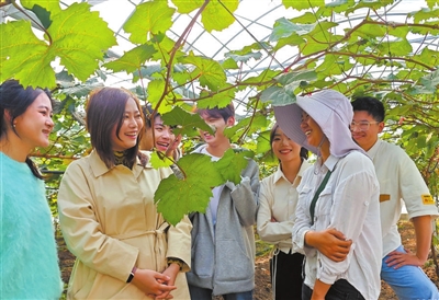 ▲為幫助學(xué)生創(chuàng)排節(jié)目,安徽藝術(shù)學(xué)院教師楊夢(mèng)姣(左一)帶領(lǐng)學(xué)生到朱女士(右一)承包的種植大棚,請(qǐng)她以親身經(jīng)歷向?qū)W生介紹黨的富農(nóng)政策給新型農(nóng)業(yè)帶來(lái)的巨大變化。