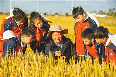 近日,江蘇省南通市通州區(qū)金沙小學(xué)組織學(xué)生來到校外田間,聽農(nóng)業(yè)技術(shù)人員講解水稻種植知識,讓學(xué)生了解種糧的艱辛,培養(yǎng)學(xué)生熱愛勞動、愛惜糧食的美德。 翟慧勇 攝