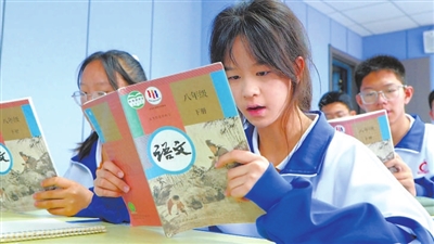 格爾木市第五中學(xué)學(xué)生在課堂上誦讀《在長江源頭各拉丹冬》。 本報(bào)記者 梁瑞哲 攝