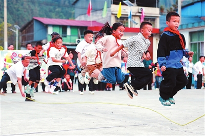 11月14日,貴州省黔東南苗族侗族自治州從江縣剛邊壯族鄉(xiāng)中心小學學生在跳繩。近年來,該校注重培養(yǎng)和引導學生養(yǎng)成良好的體育運動習慣,讓學生增強體質、健康成長。羅京來 攝