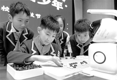 11月26日,在校園科技節(jié)上,江蘇海安高新區(qū)實驗小學(xué)學(xué)生與機器人下圍棋。該校舉行以“追科技之光 做強國少年”為主題的校園科技節(jié),通過視覺體驗、人機互動等形式,讓孩子們感受科技的魅力,激發(fā)他們對科學(xué)的興趣。