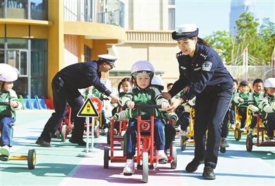 11月29日,在江西省贛州市章貢區(qū)第十九保育院,民警同小朋友玩交通安全游戲?!叭珖?guó)交通安全日”(12月2日)到來(lái)之際,各地開展交通安全主題宣傳教育活動(dòng),提高學(xué)生交通安全意識(shí)和自我保護(hù)能力。新華社發(fā)